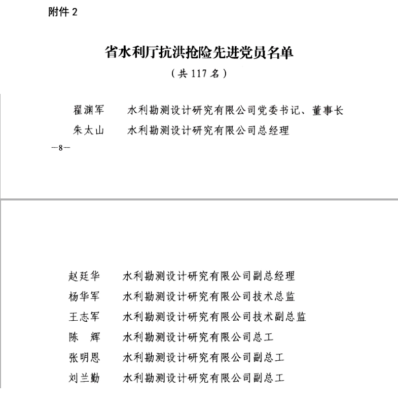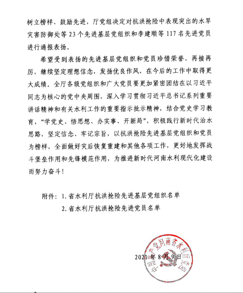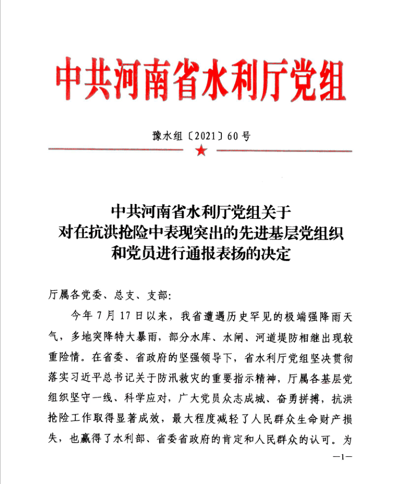 8月9日,省水利廳黨組以豫水組【2021】60號文下發(fā)了《關(guān)于對在抗洪搶險中表現(xiàn)突出的先進(jìn)基層黨組織和黨員進(jìn)行表彰的決定》,公司黨委作為省水利廳抗洪搶險先進(jìn)基層黨組織,翟淵軍、朱太山、趙廷華、楊華軍、王志軍、陳輝、張明恩、劉蘭勤等8名黨員同志作為省水利廳抗洪搶險先進(jìn)黨員受到通報表揚。