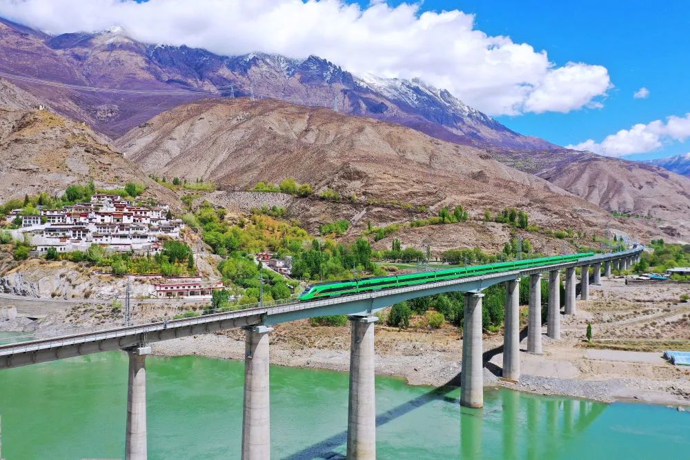 復興號列車行駛在西藏朗縣境內(2022年4月14日攝)。新華社記者 覺果 攝