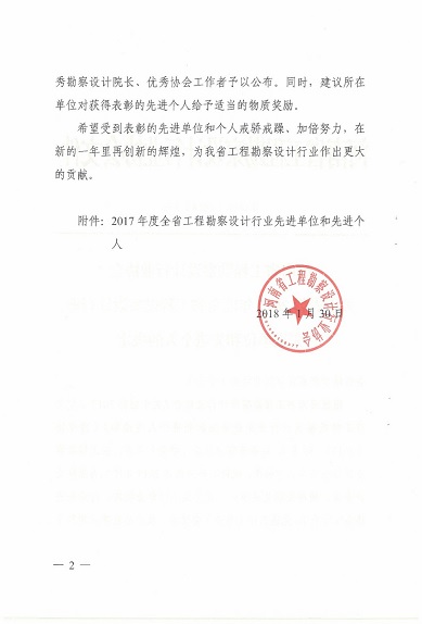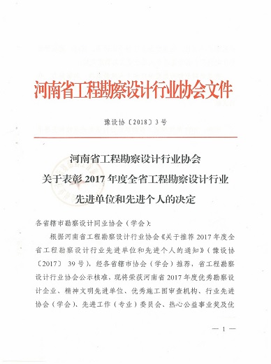 1月30日,河南省工程勘察設(shè)計行業(yè)協(xié)會發(fā)布“豫設(shè)協(xié)[2018]3號”文件,對2017年度全省工程勘察設(shè)計行業(yè)先進(jìn)單位和先進(jìn)個人進(jìn)行了表彰。設(shè)計公司榮獲“河南省2017年度優(yōu)秀勘察設(shè)計企業(yè)”、“河南省2017年度工程勘察設(shè)計行業(yè)精神文明先進(jìn)單位”、“河南省2017年度工程勘察設(shè)計行業(yè)熱心公益事業(yè)獎”等3項殊榮,公司董事長翟淵軍獲得“優(yōu)秀勘察設(shè)計院長”榮譽(yù)稱號,數(shù)字工程院白勇獲得“優(yōu)秀協(xié)會(學(xué)會)工作者”榮譽(yù)稱號。表彰文件如下:
