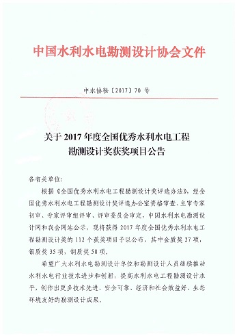 11月28日,中國水利水電勘測(cè)設(shè)計(jì)協(xié)會(huì)發(fā)布《關(guān)于2017年度全國優(yōu)秀水利水電工程勘測(cè)設(shè)計(jì)獎(jiǎng)獲獎(jiǎng)項(xiàng)目公告》 [中水協(xié)秘〔2017〕70號(hào)]文件,對(duì)獲得2017年度全國優(yōu)秀水利水電工程勘測(cè)設(shè)計(jì)獎(jiǎng)的112個(gè)項(xiàng)目進(jìn)行了表彰。設(shè)計(jì)公司報(bào)送的《南水北調(diào)中線一期工程總干渠沙河渡槽段工程》和《南水北調(diào)中線一期工程總干渠沙河南~黃河南禹州和長葛段工程》兩個(gè)項(xiàng)目,均被評(píng)為金質(zhì)獎(jiǎng)。
