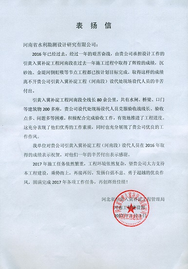 近日,公司收到引黃入冀補淀工程管理局河南工程建設部發來的熱情洋溢的表揚信,對公司為引黃入冀補淀工程2016年度建設工作的支持和配合表示衷心的感謝,對公司派駐現場設代2016年度的技術服務工作給予肯定,對設代人員頂風冒雪、放棄假日奮戰在工程建設第一線的辛勤付出充分認可,對豫水設計人的工作素質和敬業精神提出了表揚,并希望設代人員在2017年的設代工作中再接再勵、續寫輝煌。