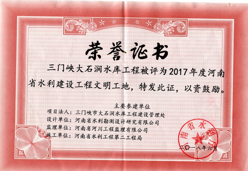 2018年6月,在各參建單位共同努力下,三門峽大石澗水庫工程被評為2017年度河南省水利建設工程文明工地。這既是對各參建單位自開工建設兩年以來認真負責、兢兢業業、共同努力建設工程的鼓勵和肯定,也是對工程后續建設的鞭策和激勵。