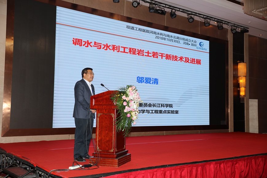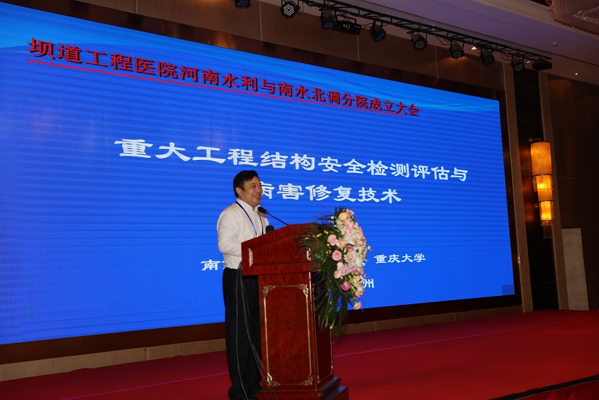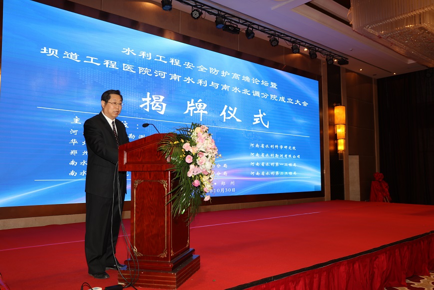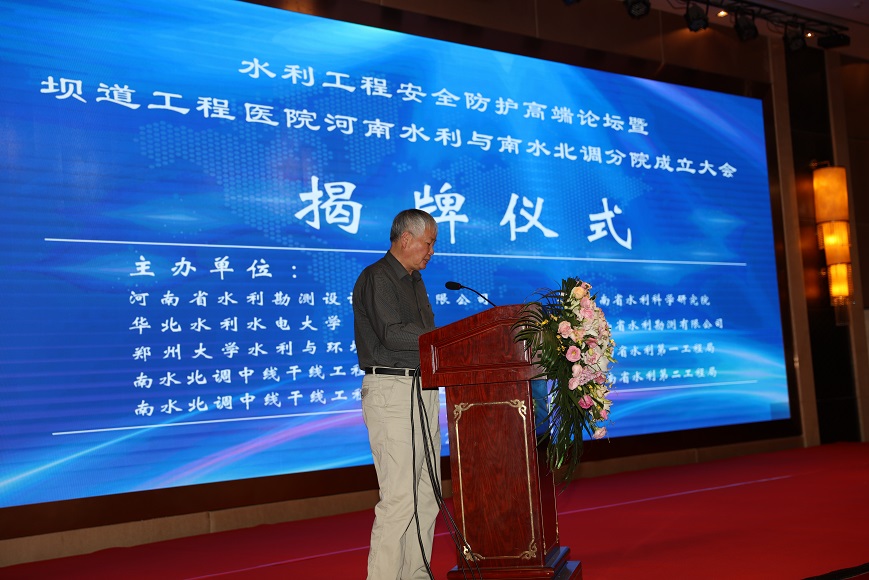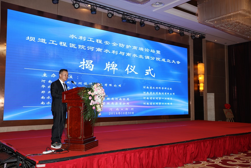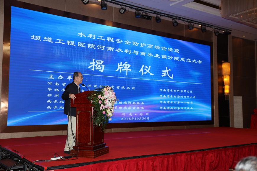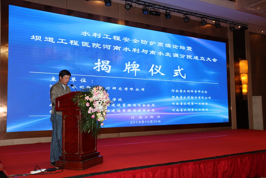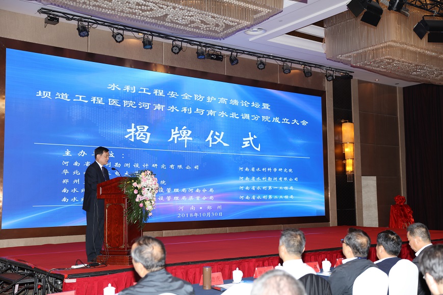 2018年10月30日上午,水利工程安全防護(hù)高端論壇暨壩道工程醫(yī)院河南水利與南水北調(diào)分院成立大會(huì)在鄭州天鵝城國(guó)際飯店隆重召開。中國(guó)工程院王家耀院士、王復(fù)明院士等來(lái)自40多家單位的領(lǐng)導(dǎo)、嘉賓200多人參會(huì)。會(huì)議開幕式由河南省水利勘測(cè)設(shè)計(jì)研究有限公司翟淵軍董事長(zhǎng)主持,華北水利水電大學(xué)劉文鍇校長(zhǎng)致歡迎辭,相關(guān)領(lǐng)導(dǎo)講話,王復(fù)明院士介紹了《壩道工程醫(yī)院建設(shè)進(jìn)展》,會(huì)議舉行了揭牌儀式和高端論壇。