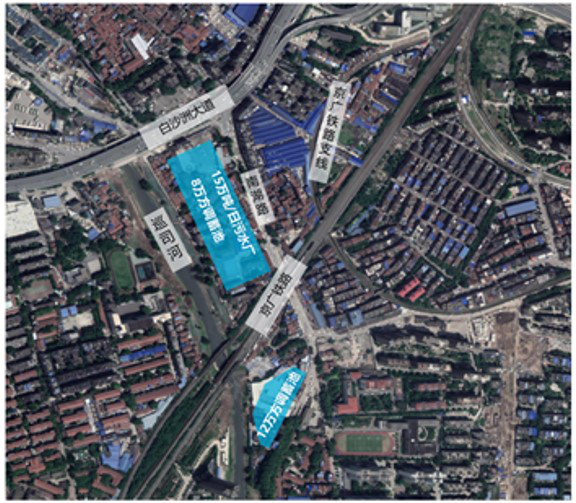 選址選線:污水處理廠與1#調(diào)蓄池合建,布置于白沙洲大道、南湖路、京廣鐵路及巡司河合圍的區(qū)域,位于京廣鐵路以北;2#調(diào)蓄池布置于曬湖箱涵與南湖路之間的三角地帶,位于京廣鐵路以南。兩處所選廠址地上均建設(shè)成為城市公園。項(xiàng)目位置如下圖所示。
