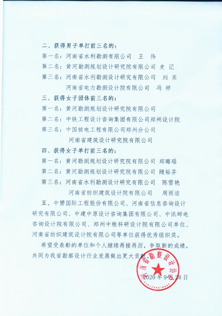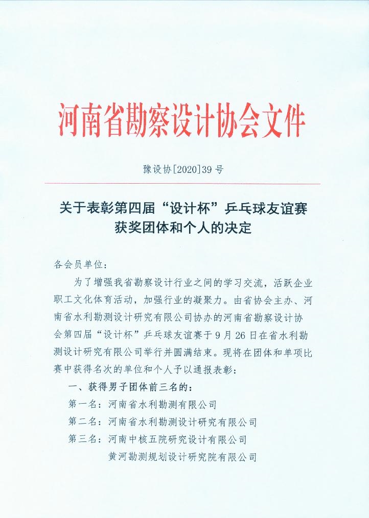 秋高氣爽,金桂飄香,為加強我省勘察設計行業職工的學習交流,活躍職工業余文化生活,增強行業的凝聚力,在雙節來臨之際,由河南省勘察設計協會主辦、我公司協辦的河南省勘察設計協會第四屆“設計杯”乒乓球友誼賽于2020年9月26日在我公司成功舉辦。