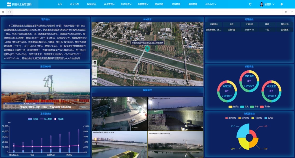 豫水設(shè)計(jì)公司工程管理院負(fù)責(zé)項(xiàng)目管理工作,把重心放在項(xiàng)目策劃和實(shí)施階段,集中力量分析管道橋工程實(shí)施的難點(diǎn)、工程風(fēng)險(xiǎn)、疫情防控壓力等,科學(xué)合理的制定管理計(jì)劃,充分發(fā)揮南水北調(diào)中線總干渠工程主設(shè)單位的技術(shù)優(yōu)勢(shì),開發(fā)了基于BIM和大數(shù)據(jù)技術(shù)的項(xiàng)目信息化管理平臺(tái),建立了工程三維虛擬模型,融合現(xiàn)場(chǎng)各維度的管理數(shù)據(jù),為管理決策提供實(shí)時(shí)、便捷、高效的信息化技術(shù)支撐。