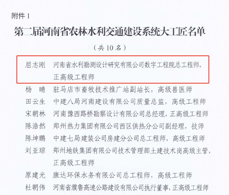 11月17日,河南省農業交通建設工會委員發布命名決定,豫水設計公司數字工程院總工屈志剛同志被命名為第二屆河南省農林水利交通建設系統大工匠,獎勵個人1萬元。本屆評選,由公司申報、水投集團推薦,屈志剛同志從眾多申報者中脫穎而出,為公司贏得榮譽。