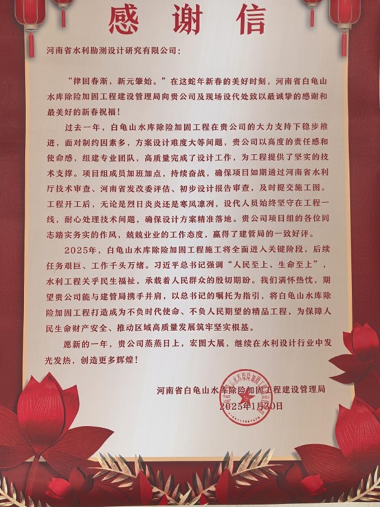 2月14日上午,河南省白龜山水庫除險(xiǎn)加固工程建設(shè)管理局趙東城局長(zhǎng)一行到訪公司,送來“精心設(shè)計(jì)鑄精品,團(tuán)隊(duì)協(xié)作展風(fēng)采”的錦旗和感謝信,以感謝公司在白龜山水庫除險(xiǎn)加固工程前期審批及建設(shè)期間的傾力付出。