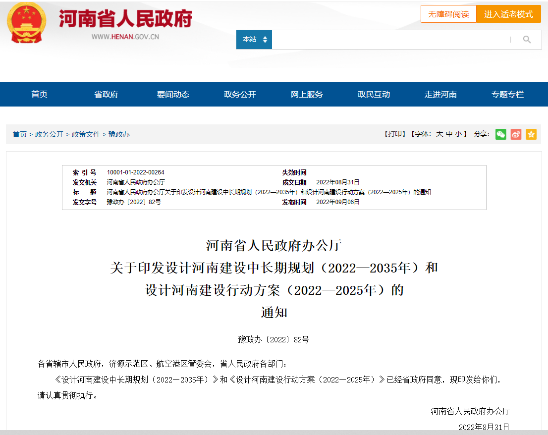 為認真落實河南省第十一次黨代會精神,加快打造設計河南,為經濟社會高質量發展提供重要支撐,9月7日,河南省人民政府辦公廳發布《設計河南建設中長期規劃(2022—2035年)》和《設計河南建設行動方案(2022—2025年)》。